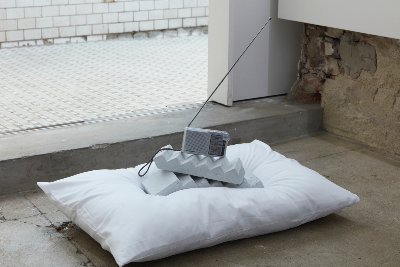 Broken stairs (concrete), pillow, FM radio, a playlist