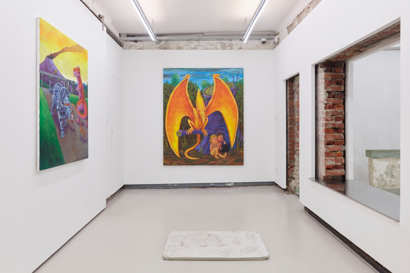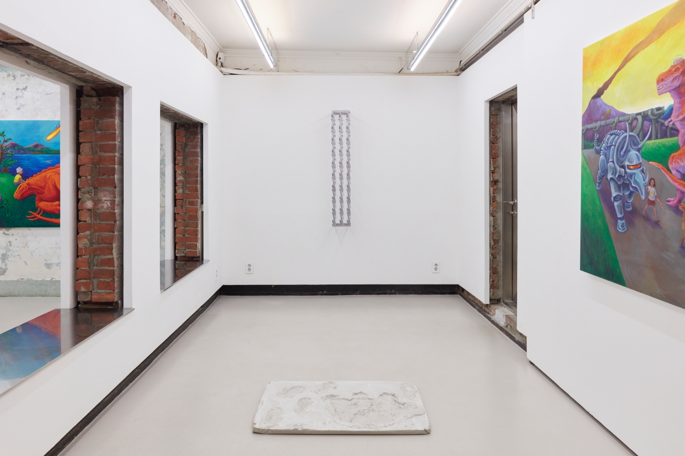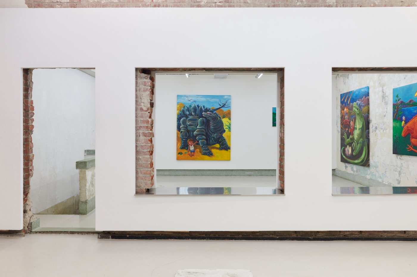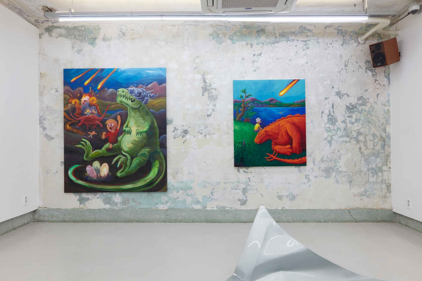 Curation, Text by Sein KimWhat is the true art of the dinosaur? The dinosaur is but an image of our fossilized backward projection, predating humanity, perpetuated by an imagination as large as their presumed size. Just as the Chinese character gong (恐) in the Korean word "dinosaur" means "fearful" but also "perhaps" or "speculatively", the image of the dinosaur must be painted with the inevitable barrenness of factuality. And that limitation can't be overcome by going back in time, because we simply did not exist back then.
