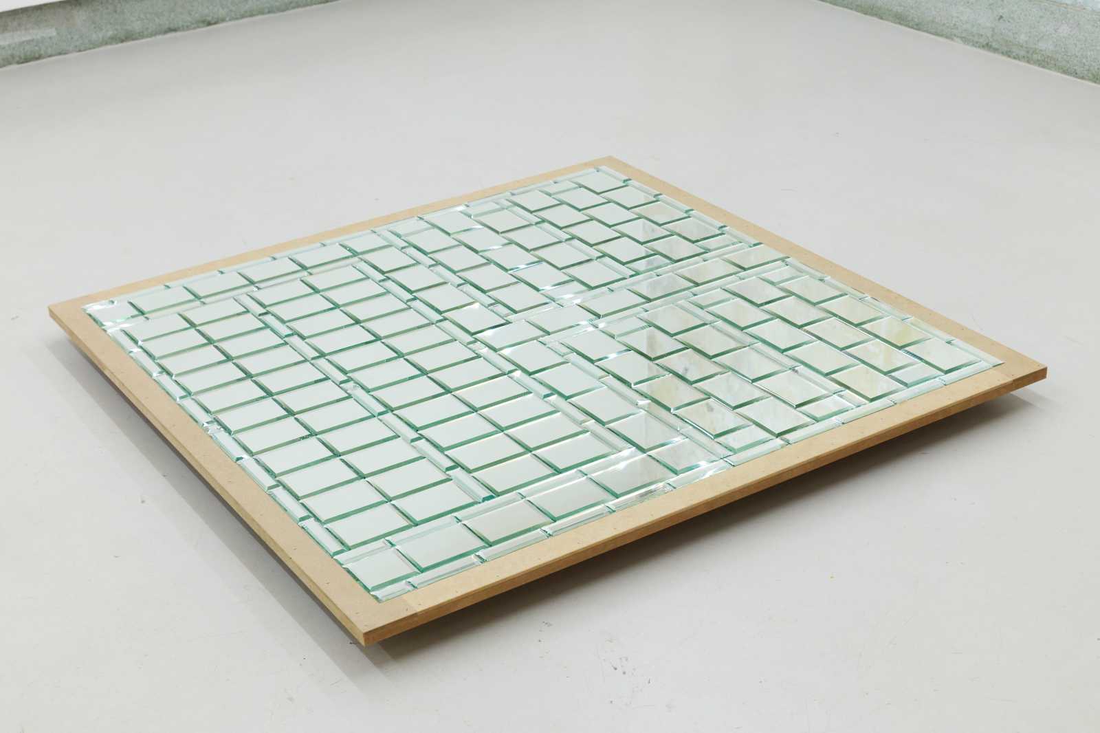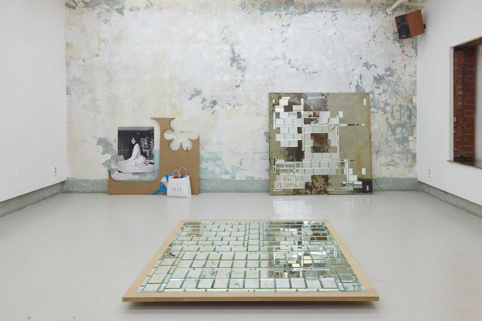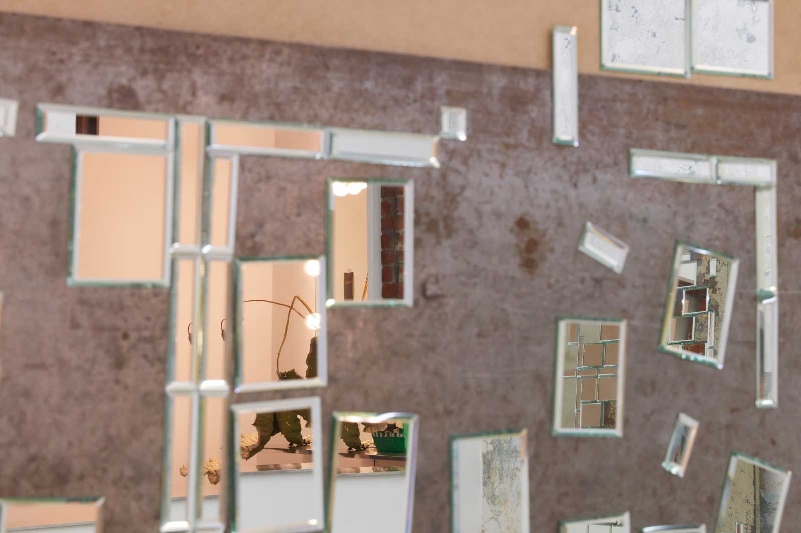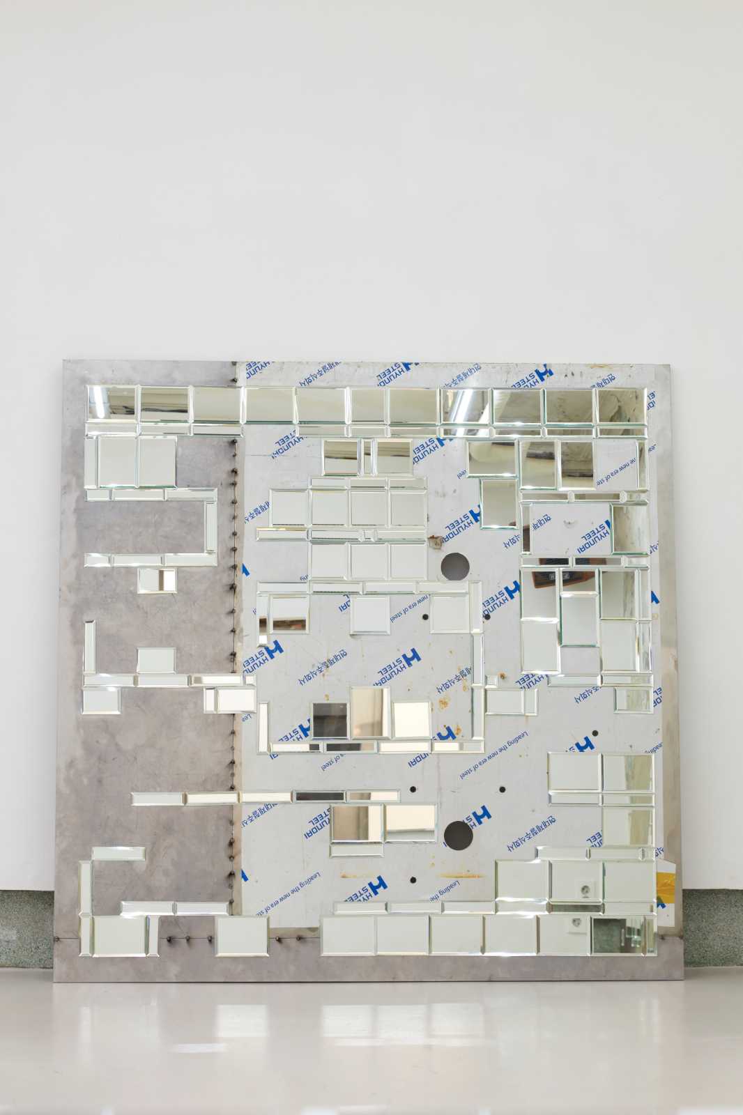 While seeking to explore and confuse the construction of memory and self-narratives, as well as architectures of remembrance and colonial continuities in the city of Mokpo, the video further contends with female labor in the globalized history of cultural production, entertainment, and transactional aspects of gifts, offerings and sacrifices.The new series of works, conceived during the artists residency in Seoul titled ‘neither one nor the other / 間’, ‘stripper / 脫’, ‘changer / 變’ and revolutionary love, mon cheri / 共 consists of four panels which are each based on an ornamentally abstracted Hanja character, composed of mirror tiles on surfaces found in the neighborhood of the gallery, old metal sheets of workshops and raw construction wood. This latest work of Mann took inspiration from the tile patterns in Seoul’s subway stations, showing Hanja characters that are related to the confucian four pillars of destiny and propagate values such as filial piety, health, marriage, luck, power and longevity. Mann suggests four alternative characters: 脫 (tal), meaning to break free, withdraw, escape, degrow, remove, take off, strip"; 間 (gan), meaning "gap, break, between, mixed up, spy, secret agent, moonlight peaking through a door " and "non-binary"; 變 (byeon), meaning "change, strange, become, turn into" and "transformation through times"; and 共 (gong), meaning "empathy, togetherness, community and sharing. Carrying ambiguous meanings these four disobedient signs unveil impertinency against propagated social norms playfully subvert the signs and ornamental structures.