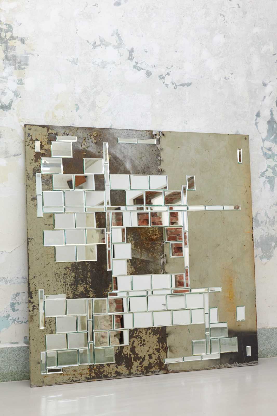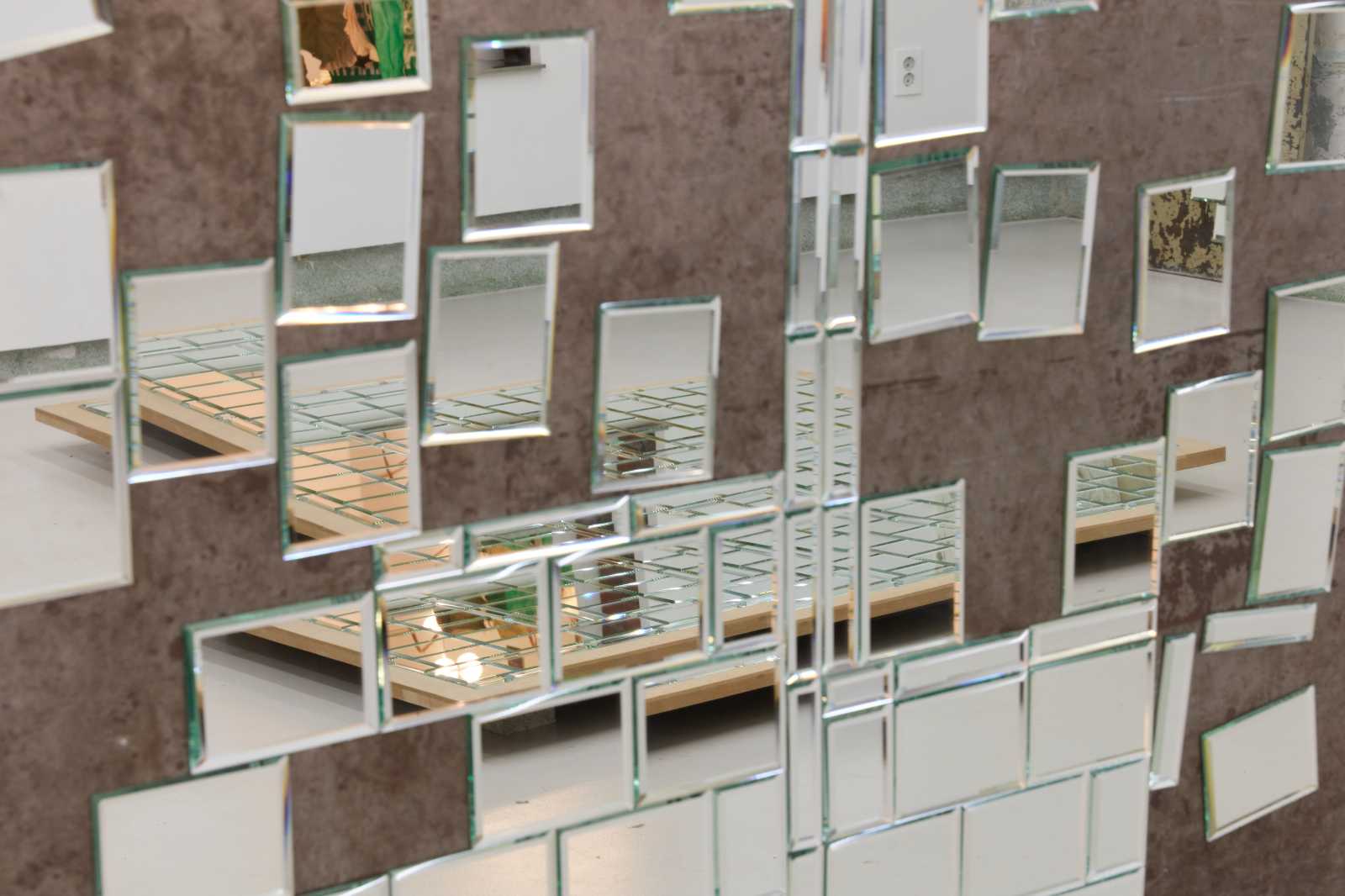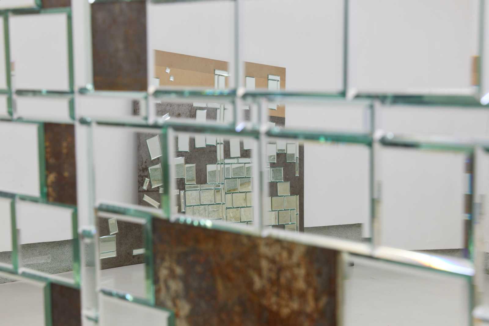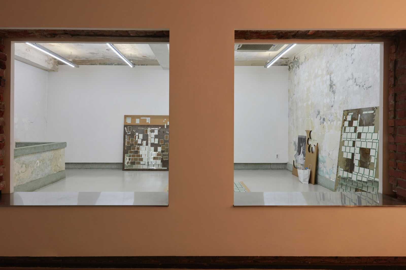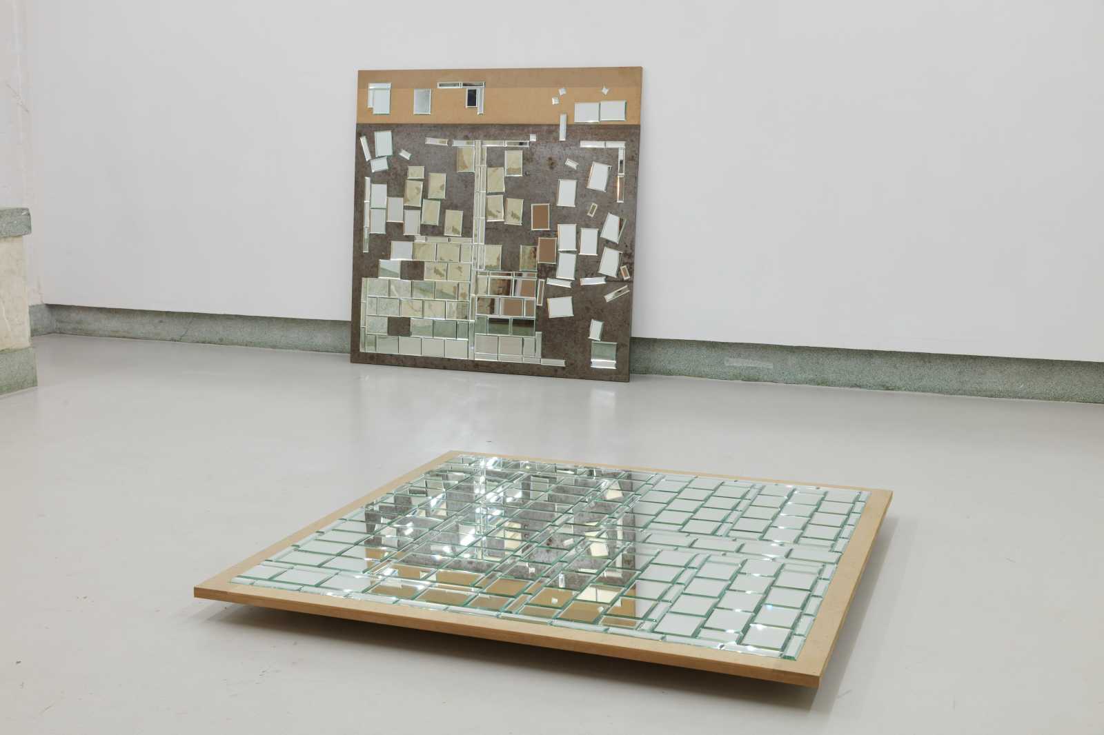 While seeking to explore and confuse the construction of memory and self-narratives, as well as architectures of remembrance and colonial continuities in the city of Mokpo, the video further contends with female labor in the globalized history of cultural production, entertainment, and transactional aspects of gifts, offerings and sacrifices.The new series of works, conceived during the artists residency in Seoul titled ‘neither one nor the other / 間’, ‘stripper / 脫’, ‘changer / 變’ and revolutionary love, mon cheri / 共 consists of four panels which are each based on an ornamentally abstracted Hanja character, composed of mirror tiles on surfaces found in the neighborhood of the gallery, old metal sheets of workshops and raw construction wood. This latest work of Mann took inspiration from the tile patterns in Seoul’s subway stations, showing Hanja characters that are related to the confucian four pillars of destiny and propagate values such as filial piety, health, marriage, luck, power and longevity. Mann suggests four alternative characters: 脫 (tal), meaning to break free, withdraw, escape, degrow, remove, take off, strip"; 間 (gan), meaning "gap, break, between, mixed up, spy, secret agent, moonlight peaking through a door " and "non-binary"; 變 (byeon), meaning "change, strange, become, turn into" and "transformation through times"; and 共 (gong), meaning "empathy, togetherness, community and sharing. Carrying ambiguous meanings these four disobedient signs unveil impertinency against propagated social norms playfully subvert the signs and ornamental structures.