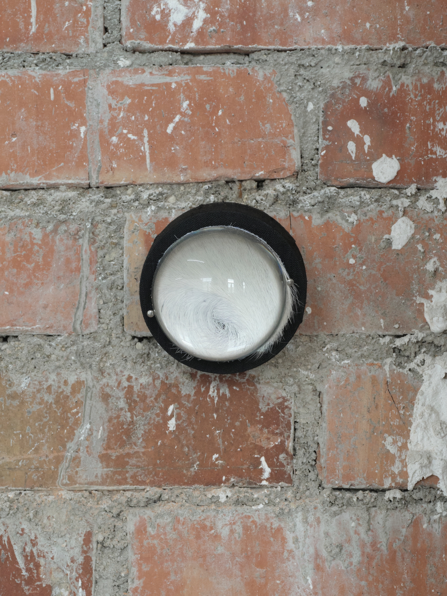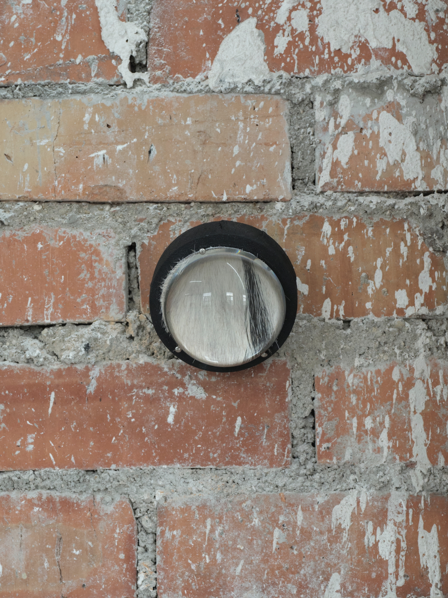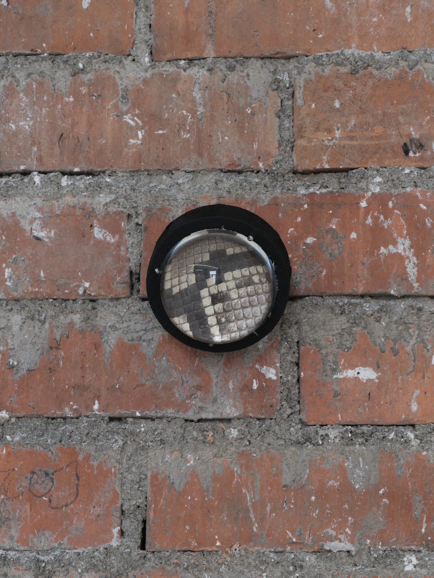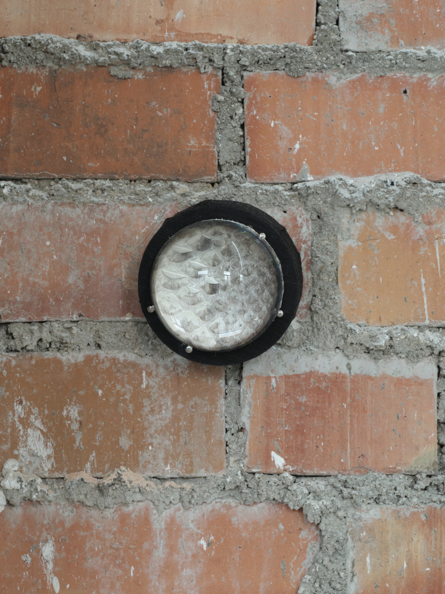 Accompanying White Lie, Everything is Personal to Me consists of head restraints from crashed cars, stripped of their outer casing and exposed to omnivorous worms. Despite the vehicle’s severe damage, the restraints remain intact, while their identifying marks vanish. As the foam is digested by mealworms, their traces emphasize the form's vulnerability. This process evokes both a shudder of excitement and disgust, as one imagines the creatures consuming the headrests where a stranger's most fragile body part once rested in a moment of a potentially deadly collison.Kim looks into the affinities of contradictory human desires through the range of mediums including staging, camera, and wall installations. Kim’s visual practice is particularly interested in the workings and makings of a stage, most recently allowing further exploration into aestheticized victimhood. The photographic series Marquee captures the monotony of adolescence, using an empty theater marquee in the artist’s living room to project pornographic images. Meanwhile, derived from the word for arched entrances in ancient Roman architecture, Vomitoria (passageways), emerging from video or photographic roots, reveals a unique materiality by reflecting leather’s texture through the transparency of a glass paperweight. “Box Elizabethan” is a series of structures resembling a box or a partition, constructed using the repeated form of cigarette carton dust flaps. This assemblage is then covered with unborn calf hide in wet blue (moist chrome-tanned). Kim has found a visual similarity between paper templates of a cigarette box and the historic diagram of the Elizabethan theaters, as well as a resemblance between the several aspect ratios of cinema thus far, and those of the carton assembly. In the process of exploring unfamiliar subjects, and most recently, transforming them into sculptural forms, he embraces overlapping and transforming elements, hence positions himself as both an internal participant and external voyeur.