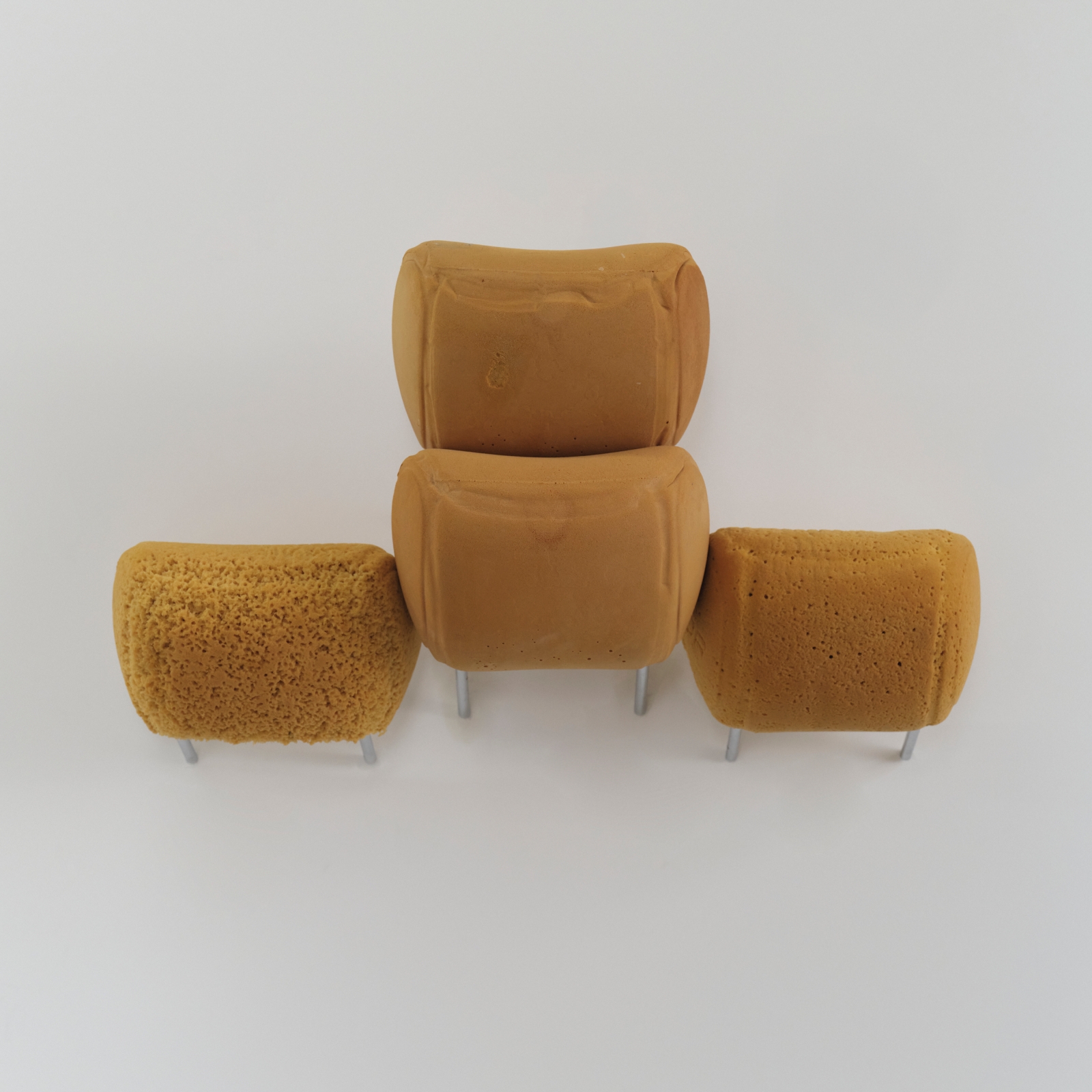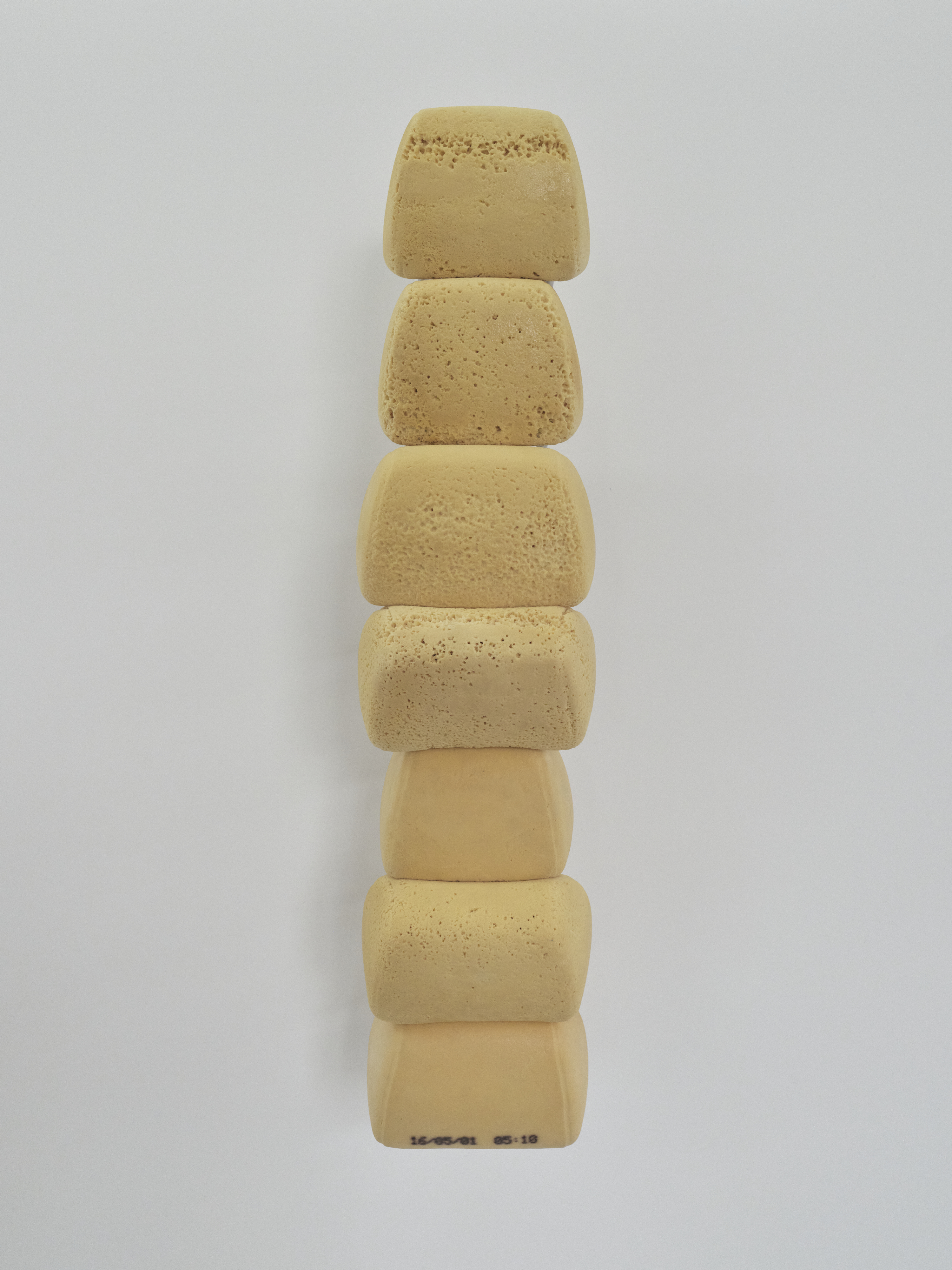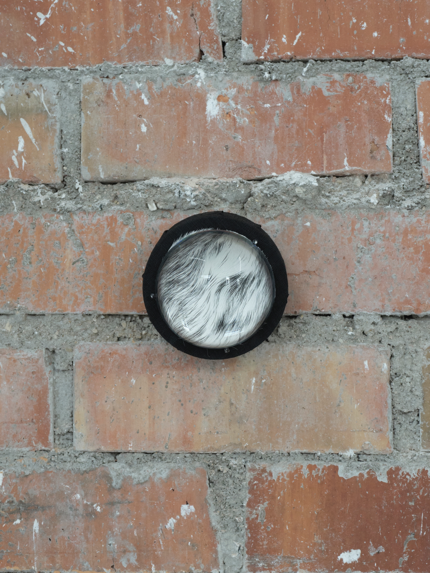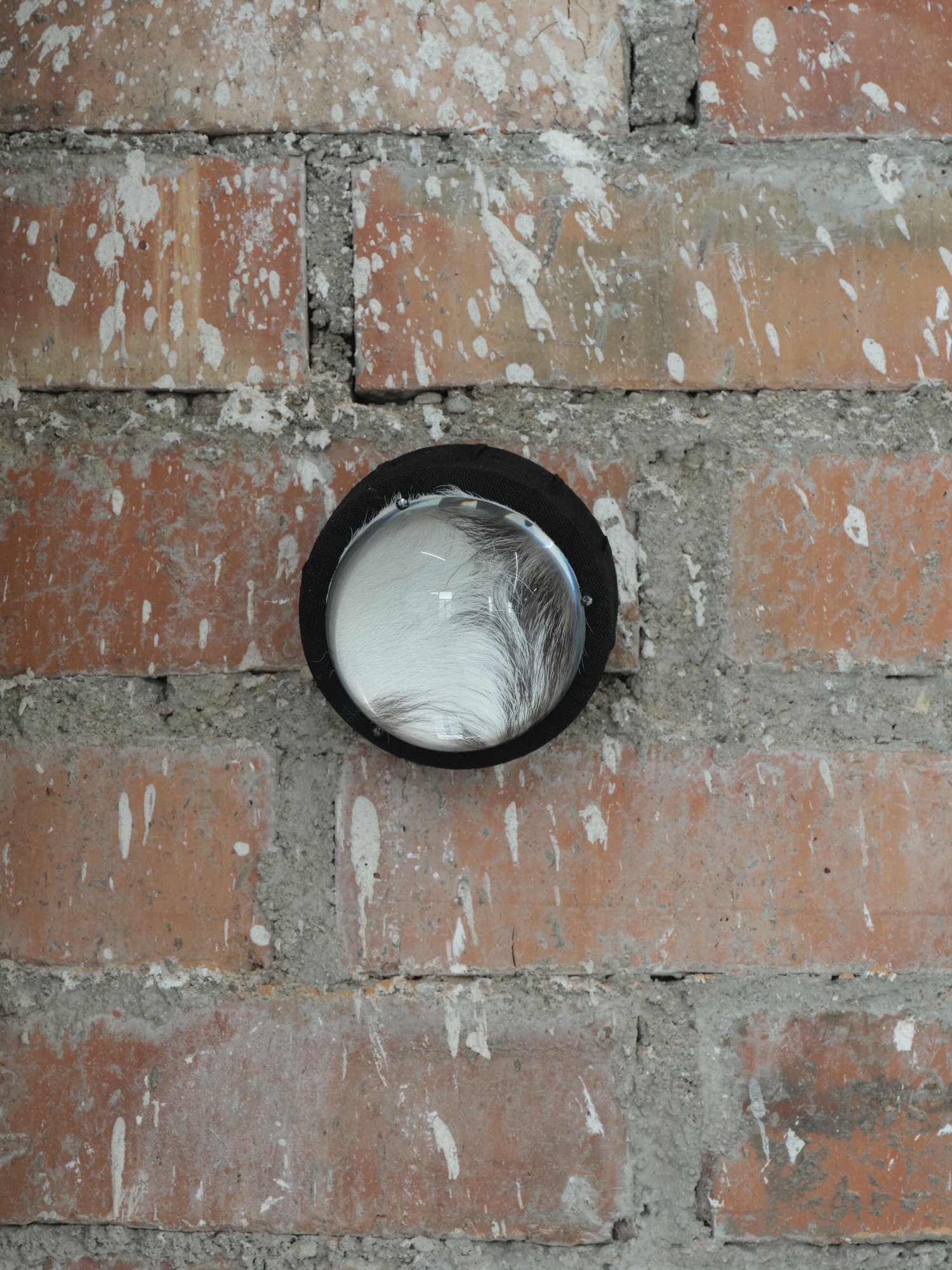 Accompanying White Lie, Everything is Personal to Me consists of head restraints from crashed cars, stripped of their outer casing and exposed to omnivorous worms. Despite the vehicle’s severe damage, the restraints remain intact, while their identifying marks vanish. As the foam is digested by mealworms, their traces emphasize the form's vulnerability. This process evokes both a shudder of excitement and disgust, as one imagines the creatures consuming the headrests where a stranger's most fragile body part once rested in a moment of a potentially deadly collison.Kim looks into the affinities of contradictory human desires through the range of mediums including staging, camera, and wall installations. Kim’s visual practice is particularly interested in the workings and makings of a stage, most recently allowing further exploration into aestheticized victimhood. The photographic series Marquee captures the monotony of adolescence, using an empty theater marquee in the artist’s living room to project pornographic images. Meanwhile, derived from the word for arched entrances in ancient Roman architecture, Vomitoria (passageways), emerging from video or photographic roots, reveals a unique materiality by reflecting leather’s texture through the transparency of a glass paperweight. “Box Elizabethan” is a series of structures resembling a box or a partition, constructed using the repeated form of cigarette carton dust flaps. This assemblage is then covered with unborn calf hide in wet blue (moist chrome-tanned). Kim has found a visual similarity between paper templates of a cigarette box and the historic diagram of the Elizabethan theaters, as well as a resemblance between the several aspect ratios of cinema thus far, and those of the carton assembly. In the process of exploring unfamiliar subjects, and most recently, transforming them into sculptural forms, he embraces overlapping and transforming elements, hence positions himself as both an internal participant and external voyeur.