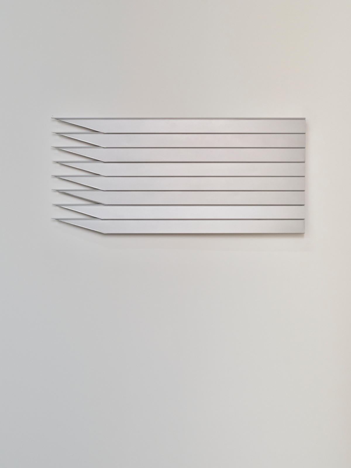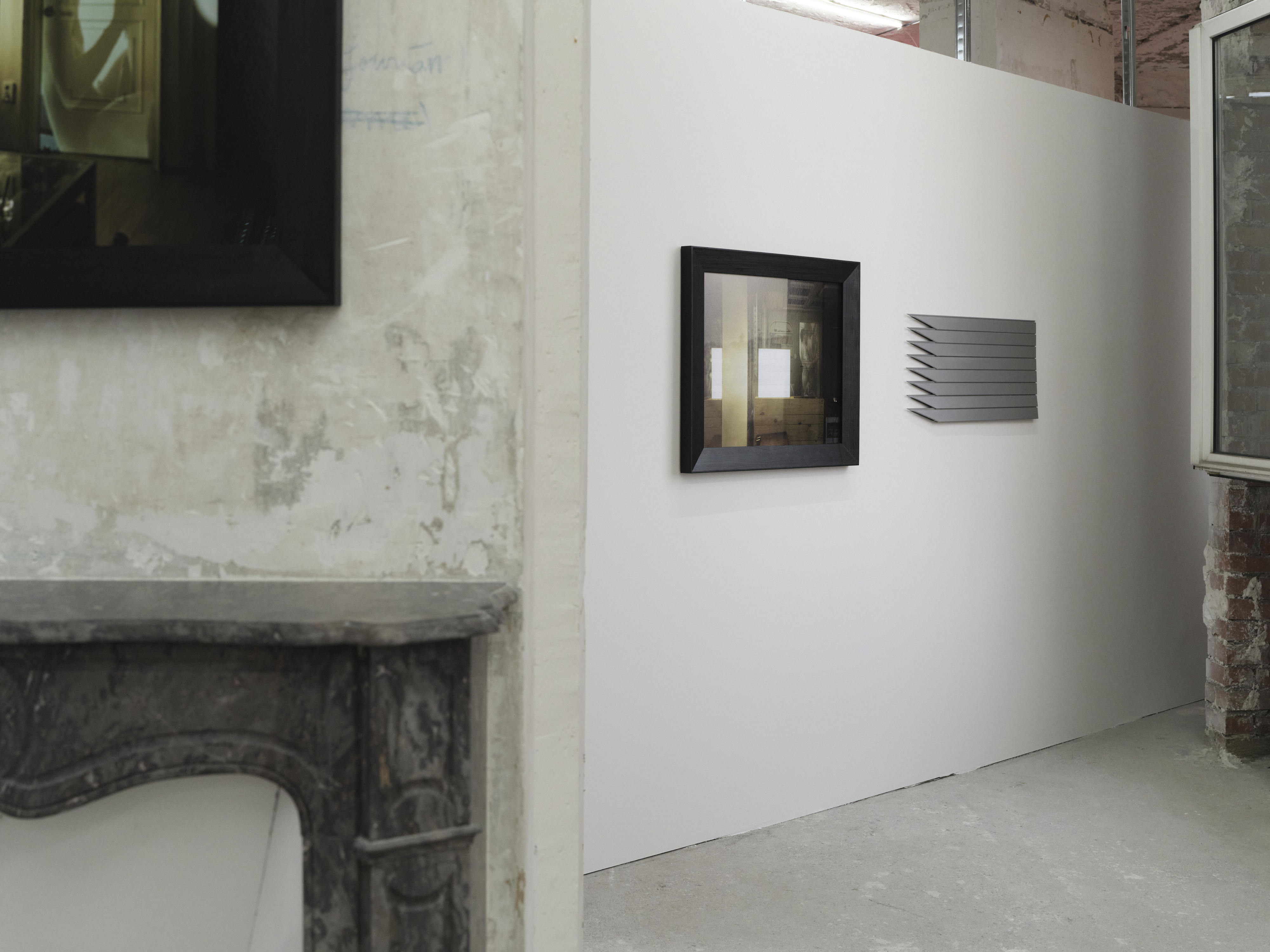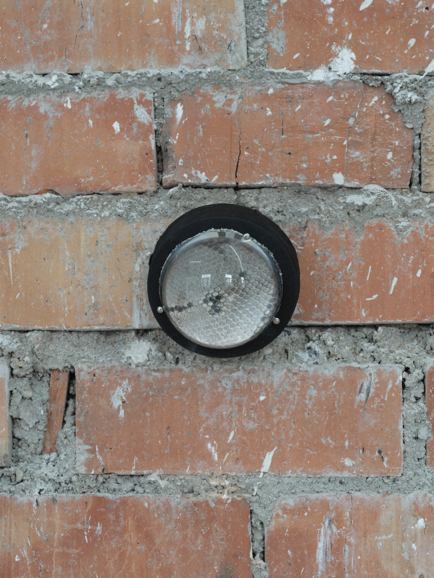 Chung examines probing performative conditions that invite subordination to and deviation from societal structures within urban relics. Through diverse artistic mediums—ranging from sculpture, installation, sound, text, and photography—she merges personal and social elements of complacency toward power structures and the desire to deviate from them, inhabiting a space between hope and lethargy. With an exaggerated minimalist approach, she adopts a seemingly paradoxical strategy that reflects nuanced obedience and coercion. White Lie depicts a half-open rolling door resembling a guillotine. The title refers to the seemingly harmless lies people tell to maintain relationships and avoid minor conflicts. These