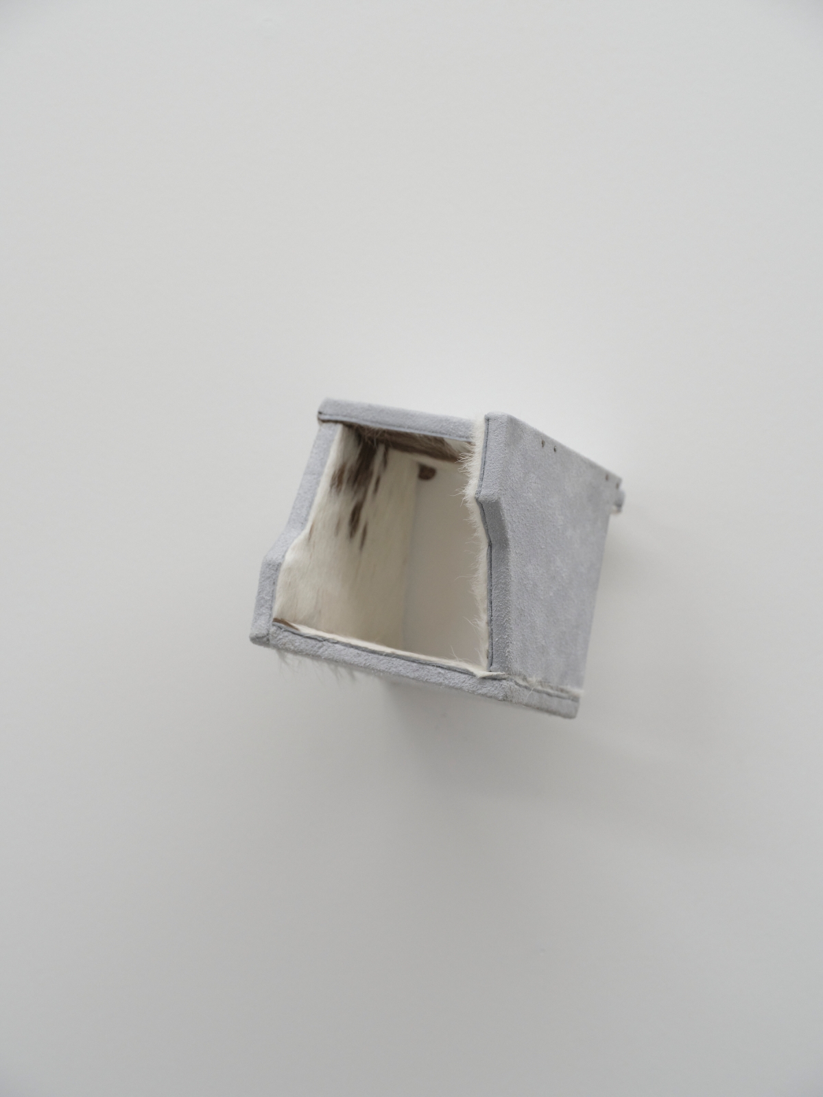 enlarged cigarette carton dust flaps in wood, steel nails, unborn calf hide in wet blue (moist chrome-tanned)