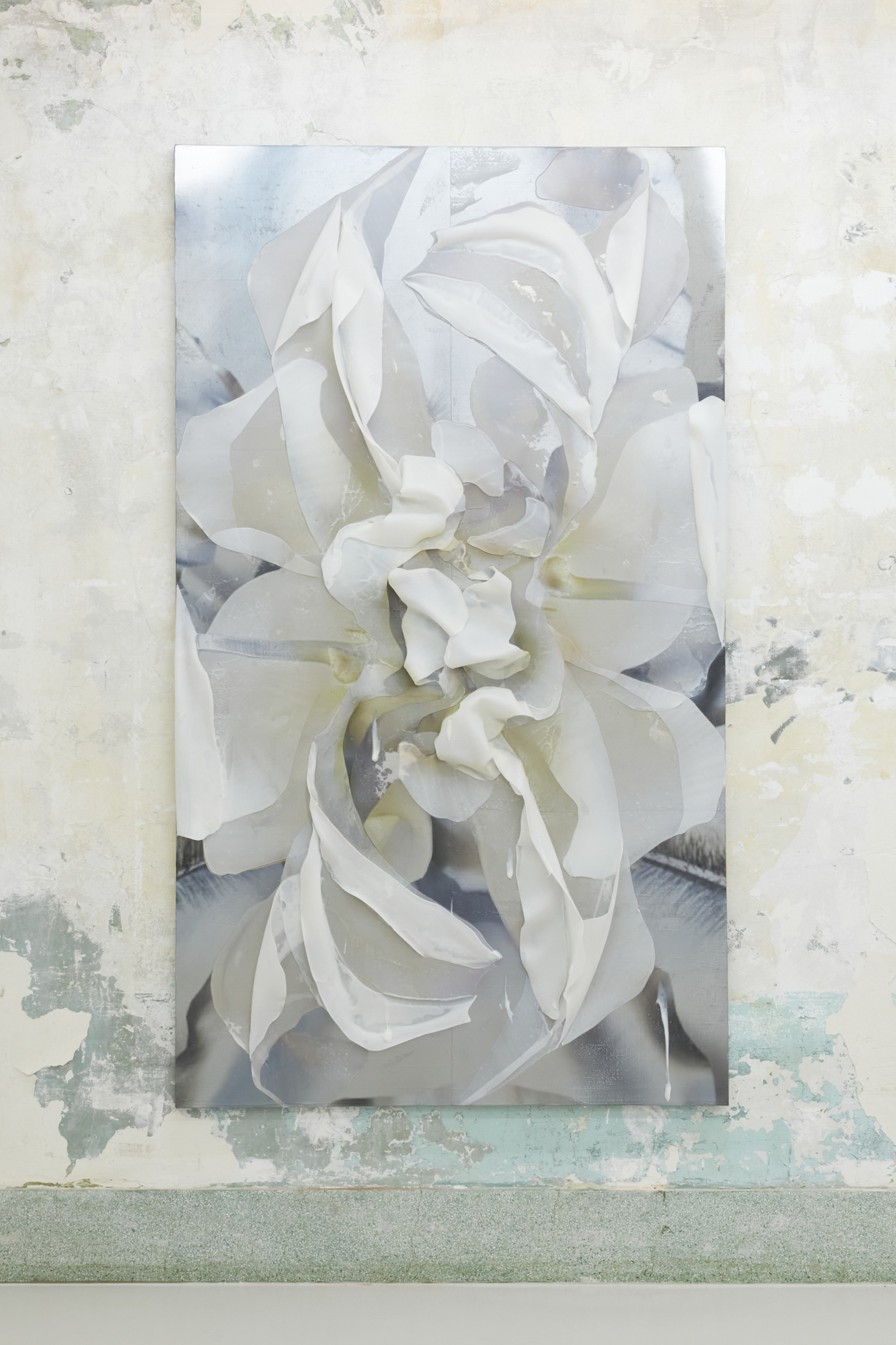 acrylic and gel medium, UV print, chrome paint on canvas