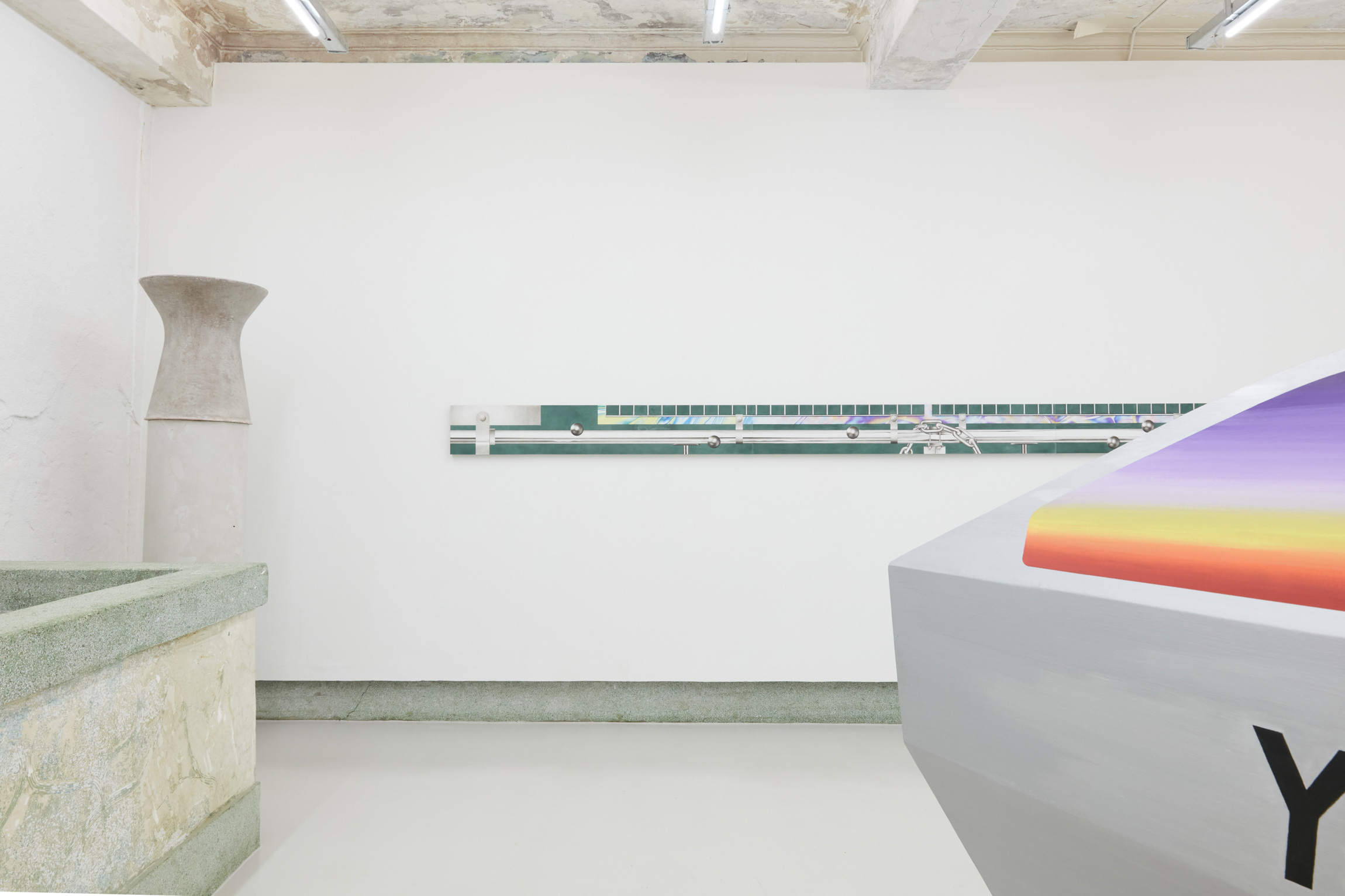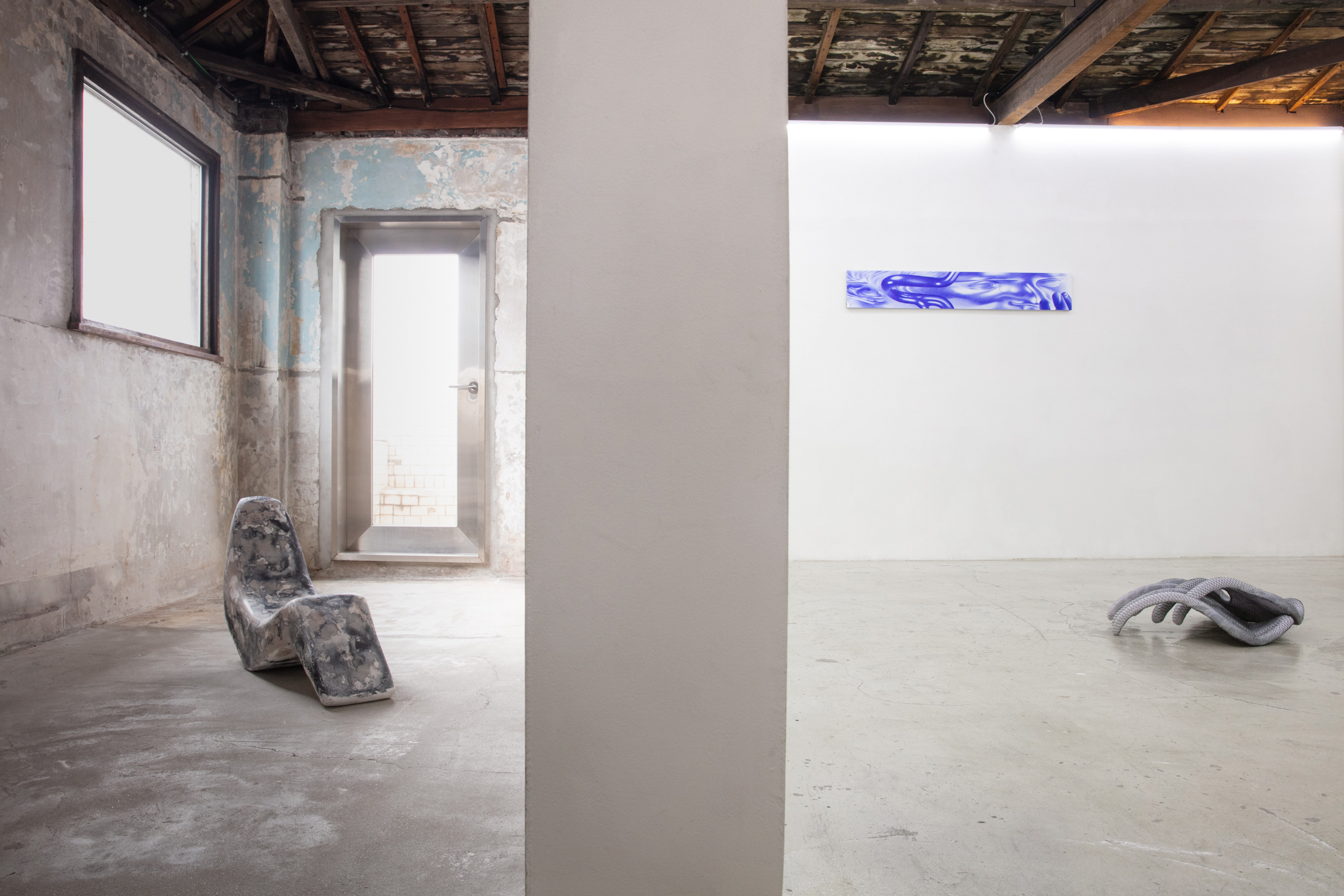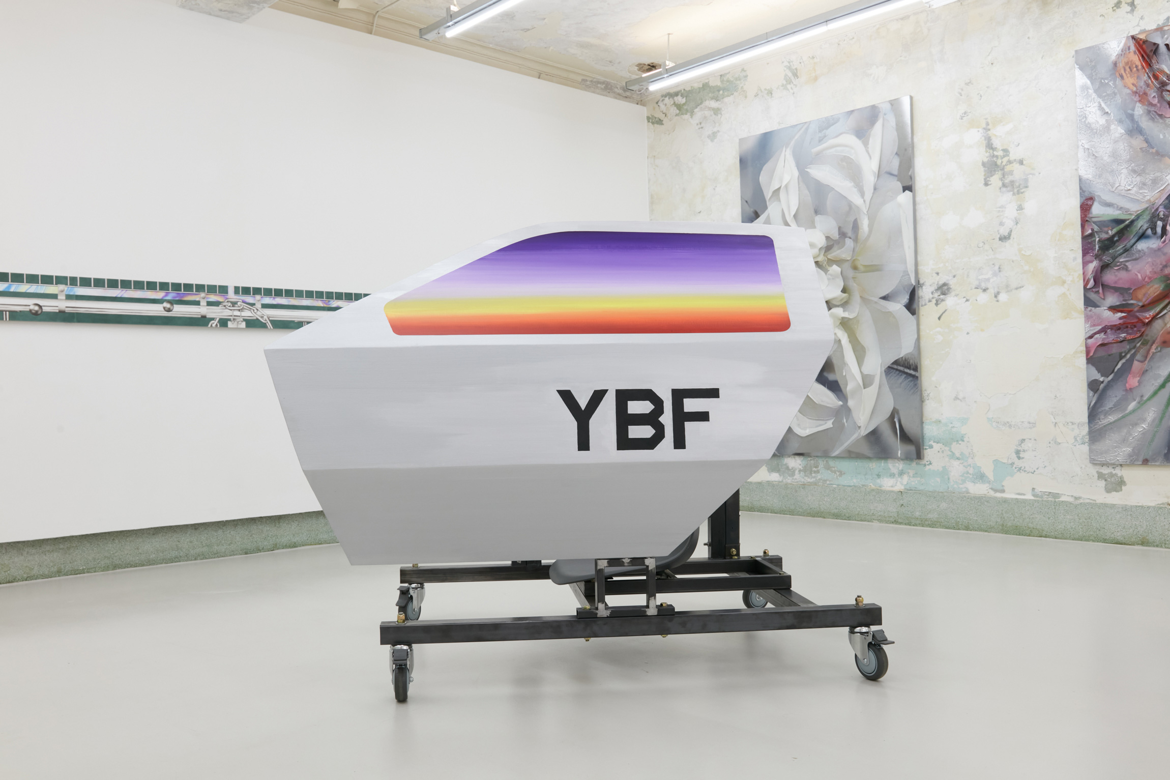 Steel, wood, canvas, pigment, acrylic, plastic chair, castors
