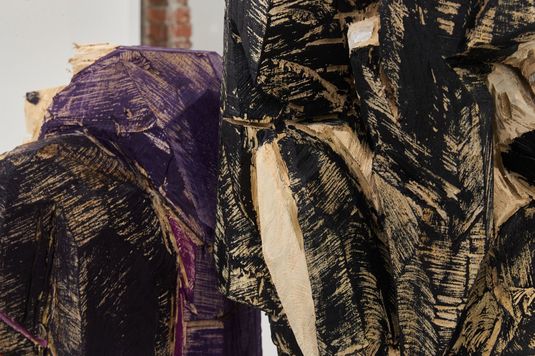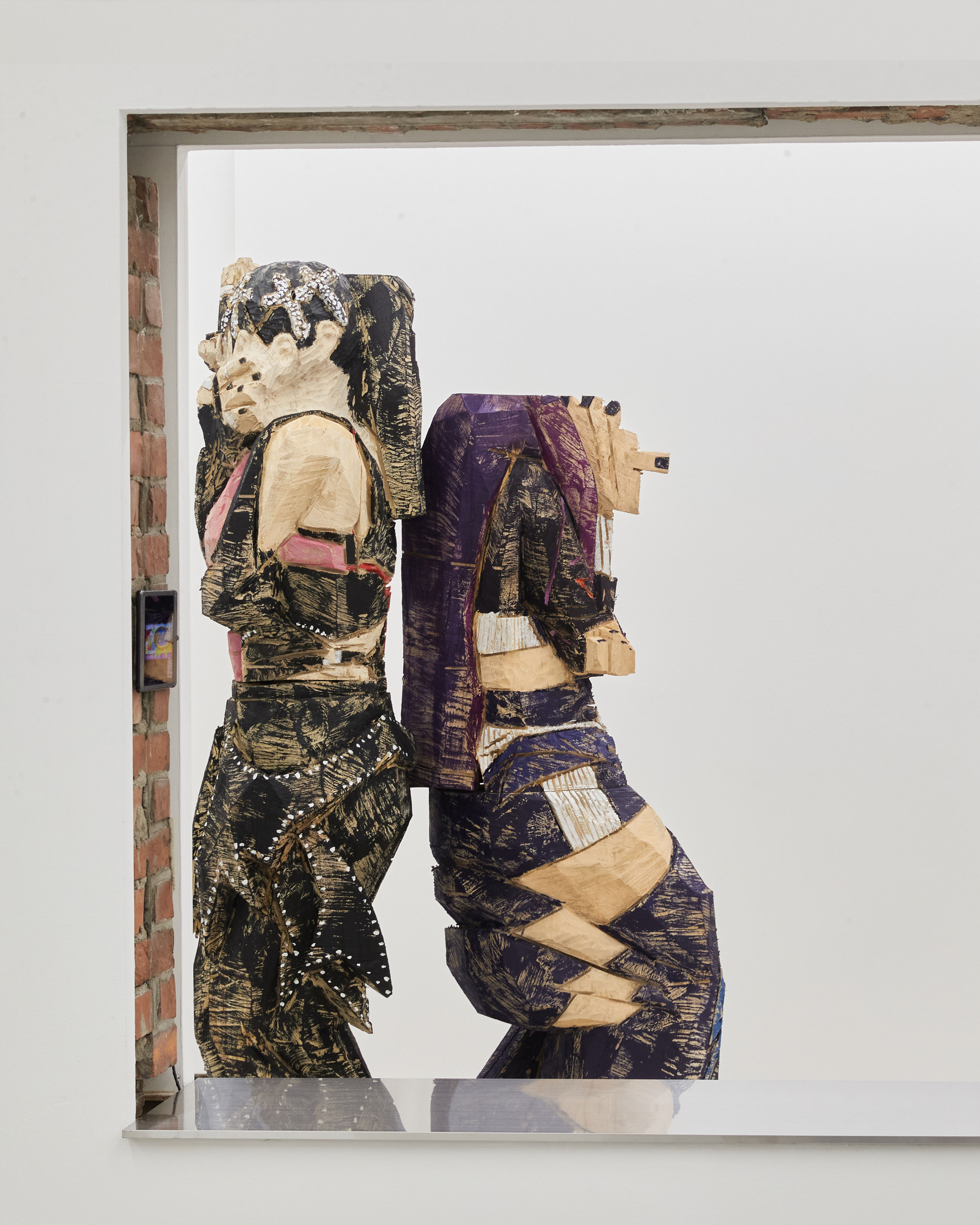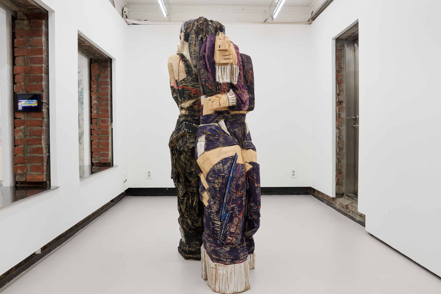 아티스트 자신과 페르소나를 분리된 아바타로 동등하게 선보이는 걸그룹 에스파는 그동안 NCT와 더불어 이동훈의 조각적 실천의 소재 안에 있었다. 이동훈은 아이돌의 안무를 해체하여 특정 동작의 구간을 독립된 조각 안에서 연속성 있게 박제하고, 목조각 형식에서 부각될 수 있는 조각적 특성을 의상의 주름, 소재, 패턴 중심으로 선택해왔다. 작가는 아티스트십과 불가분의 관계인 페르소나를 작가 자신을 향한 내면화의 과정을 거치지 않고, 아이돌과 엔터테인먼트 산업 자체가 갖는 아티스트십의 본질적인 특성에 주목하므로 제 삼자의 태도로 페르소나를 구현한다. 다른 그룹과 다르게 네 명의 멤버에서 파생된 각각의 가상 아바타를 창조한 에스파는 2020년을 기점으로 ‘SYNK, KARINA’의 티저 영상을 통해 이들이 추구하는 세계관을 소개했다. 이동훈이 선택한 카리나 전신상(Savage1, 2022)과 마주보고 있는 아이-카리나(ae-KARINA) 전신상(Savage 2, 2022)은 둘의 퍼포먼스를 통해 실존 인물과 아바타의 경계를 모호하게 한다. 묵직한 덩어리감과 날카롭게 깎은 파편화된 목조각의 속성 위에 의상의 패턴과 움직이는 동작을 거칠게 채색한 느릅나무의 질감은 분리된 페르소나를 구분 짓기 어렵다. 여기서 의상의 차이를 아는 관객만이 둘을 구분하게 되는데, 그렇지 않은 이들은 팔 동작만 움직이는 정적인 검정 하반신의 실제 카리나와 역동적인 안무를 포착한 아이-카리나 사이에서 링크되는 순간을 발견할 수 있다. 이처럼, 자아와 자아의 아바타가 때로는 함께, 때로는 분리되어, 메타버스에서 실존 관객층을 집결하거나 현실 세계에 가상의 혼성적 존재를 소화하는 구조는, 우리에게 여덟 명을 동등하게 바라보기를 강조하고자 하는 대중문화 산업의 태도에 기반한다. 결국, 우리는 일반적으로 인지했던 시공의 감각이 교묘하게 아바타와 환경이 연동하는 어색함과 함께 자아와 페르소나의 간극이 오작동하는 감각을 수용하게 되는 유기적인 산업 구조에 적응하고 있을 것이다.'날 닮은 너, 널 닮은 나'